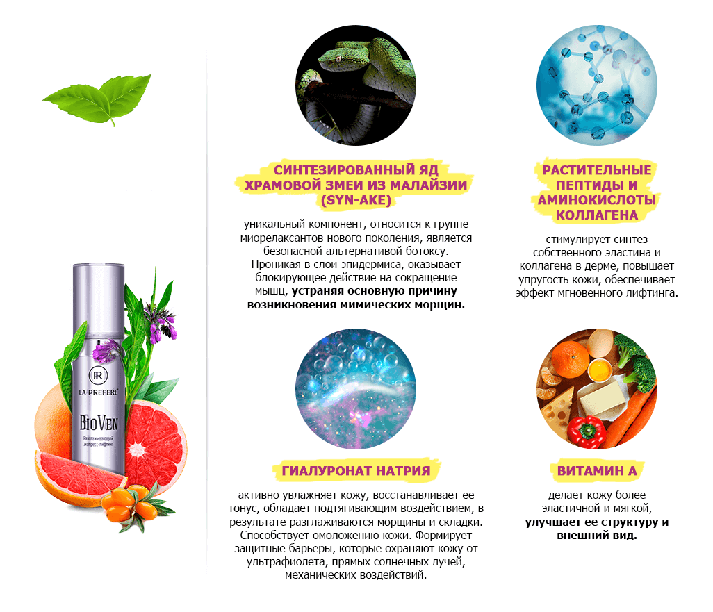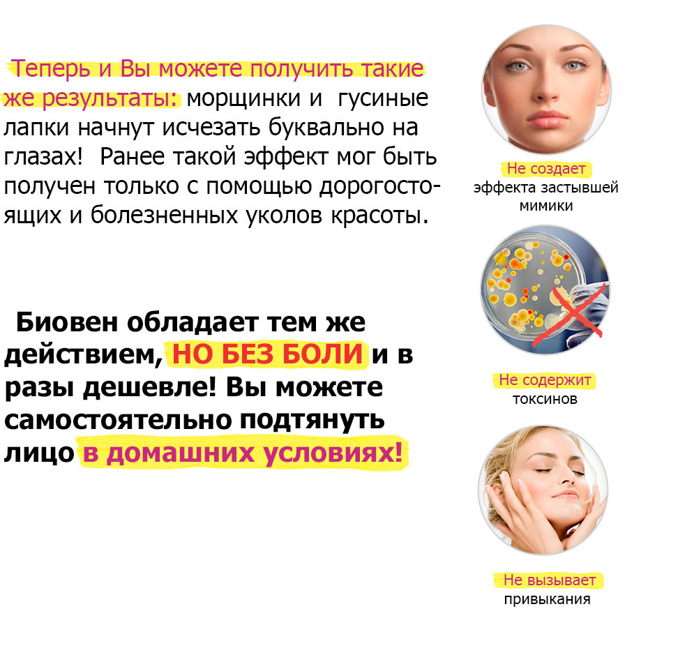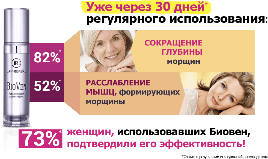 Революционная формула Биовена расслабляет лицевые мышцы, за счет чего количество морщинок и гусиных лапок сокращается.